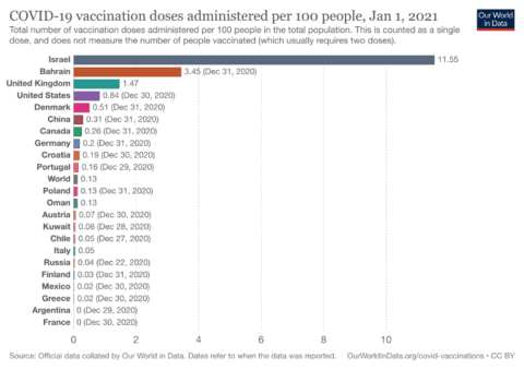 In Israel, vaccination centres are open 24 hours, 7 days a week with no break for holidays or even the Sabbath. Enhanced access and a coordinated distribution and communication strategy have allowed more than 1 in 10 Israelis to have received their first dose of vaccine to date. Canada by comparison, as of December 30th, had vaccinated only 99,559 or 2.6 per 1,000 people.